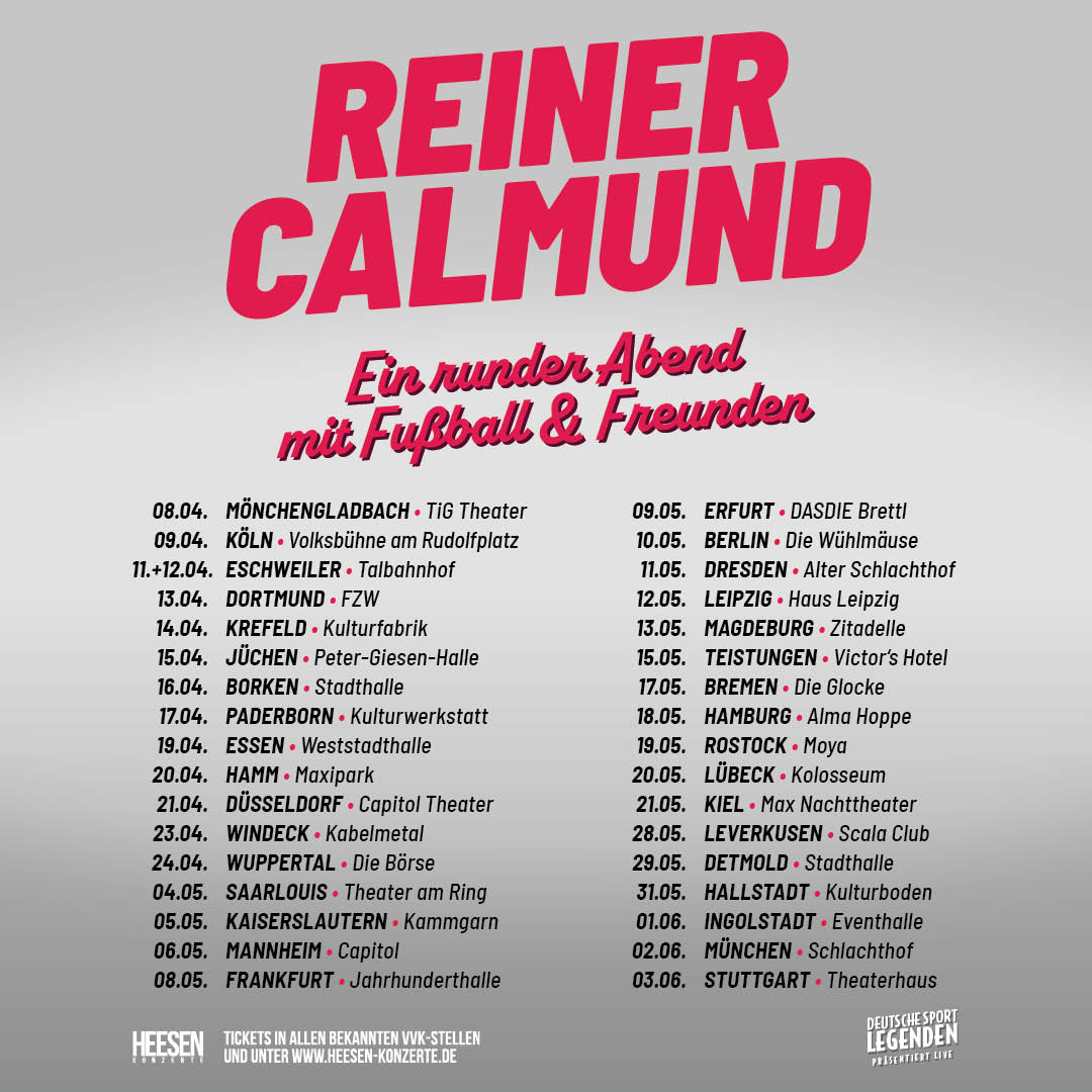 Er ist Kult, er ist Meinung, er ist Fußball pur: Reiner Calmund lädt ein zum großen Live-Fußball-Talk – vollgepackt mit spannenden Geschichten, ehrlichen Worten und jeder Menge Herzblut.